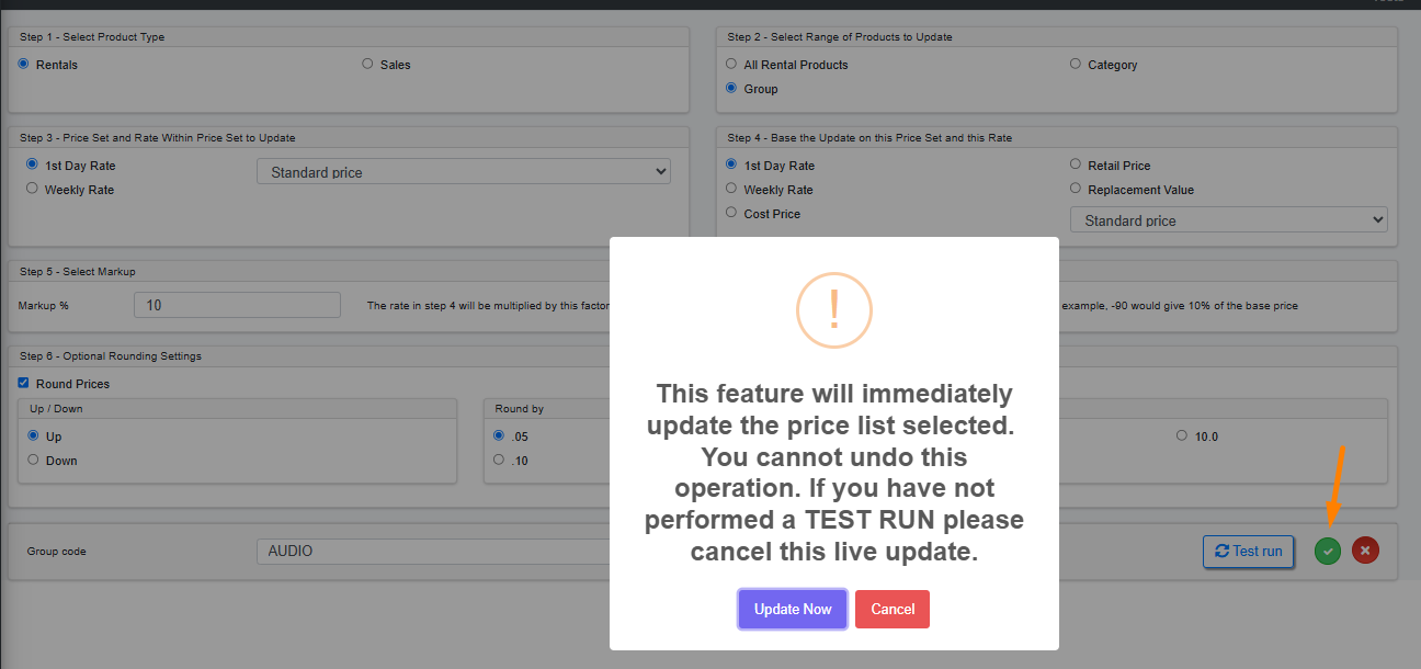 Only when you are happy with your TEST RUN data click the green checkmark to proceed with your pricing update.