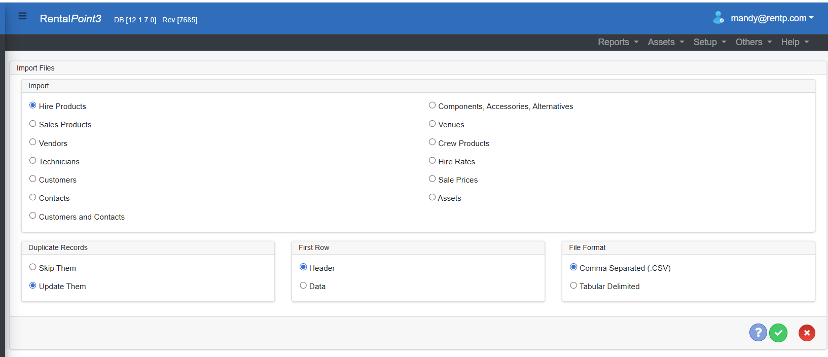 - 1. While backups are taken of your database nightly, it is advisable to contact support@rentp.com requesting a backup be taken prior to importing data as this operation is not reversible.