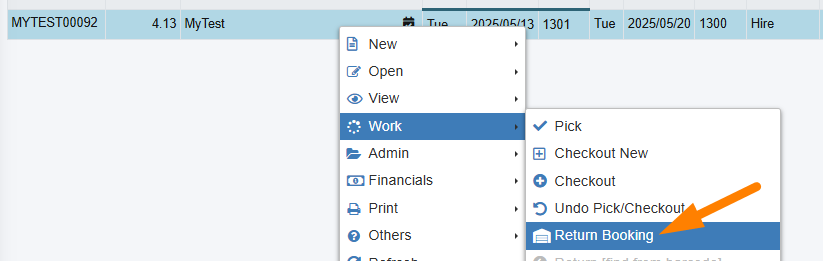 | From the Bookings Control Panel 'Work' menu select the Return [find from barcode]![]() | From the Bookings Control Panel 'Work' menu select the Return Booking option