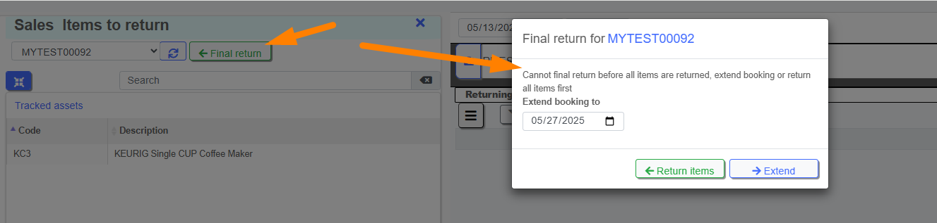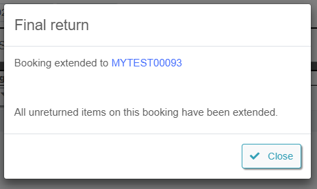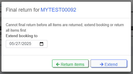 If you try to Final Return a booking that does not have all of it's items returned, you will be prompted with an option to extend all OUT gear to a new booking.
