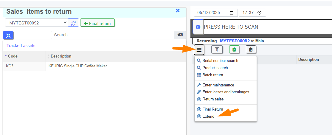 Access the EXTEND option from within the Return Window.