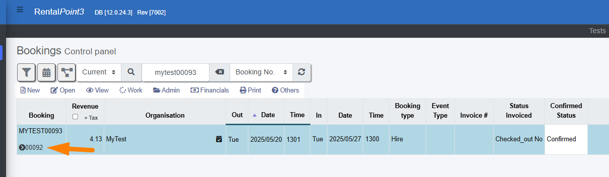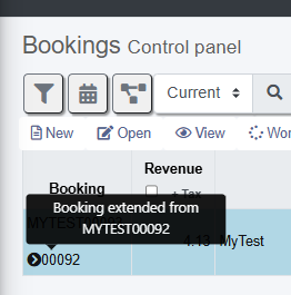 The booking grid shows the origin of the extended booking. In the example below, the original booking was MYTEST00092